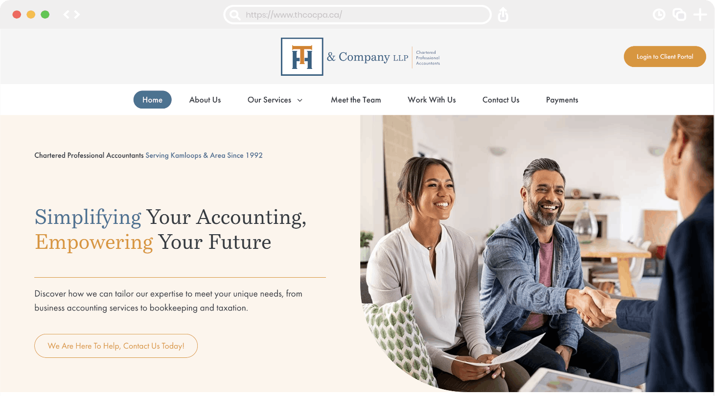 Operating in Kamloops, B.C. since 1996, TH & Company CPA was looking to rebrand and update their website to their new name. With their new colours of burnt orange, slate blue and white, we created their new website - focusing on highlighting their well-rounded services and high-level of expertise provided.